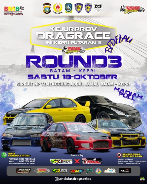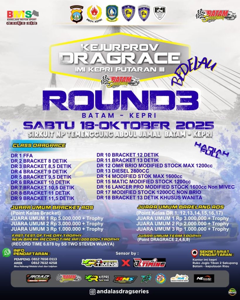 Konikepri.id – Ajang Kejuaraan Daerah Drag Race Kepri BMS Championship Putaran 3 Tahun 2025 siap digelar di Sirkuit Non Permanen Temenggung Abdul Jamal, Batam, pada 18–19 Oktober 2025. Kegiatan ini menjadi salah satu agenda otomotif terbesar di Kepulauan Riau tahun ini, dengan dukungan penuh dari Batam Speedway, Barelang Motor Sport, dan IMI Kepri.